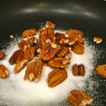 - In a skillet over medium heat, stir 1/4 cup of sugar together with the pecans. Continue stirring gently until the sugar has melted and caramelized the pecans, then transfer the nuts onto waxed or parchment paper. Allow this to cool then break into smaller pieces.