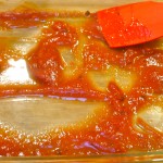 - Place seam side down in a 13 inch baking dish which has a thin layer of tomato sauce covering the bottom. (I used Ragu spaghetti sauce.)