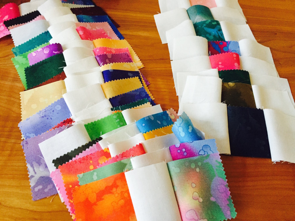 If you’ll notice, I made two different sets ~ the first had white on each end with a colored fabric in the middle and the second had colored pieces on the ends and a white piece in the middle. Â I then put those in separate piles.